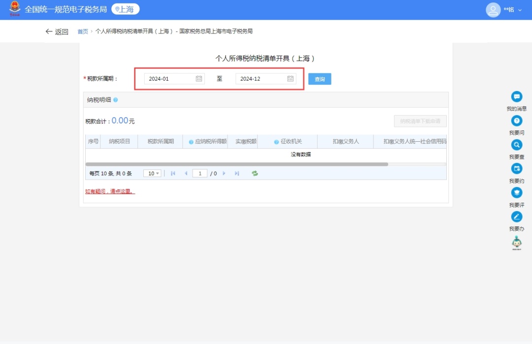 步骤3:选择您要开具的税款所属期(可以跨年选择),点击“查询”。系统会将查询到的纳税清单显示在页面下方。