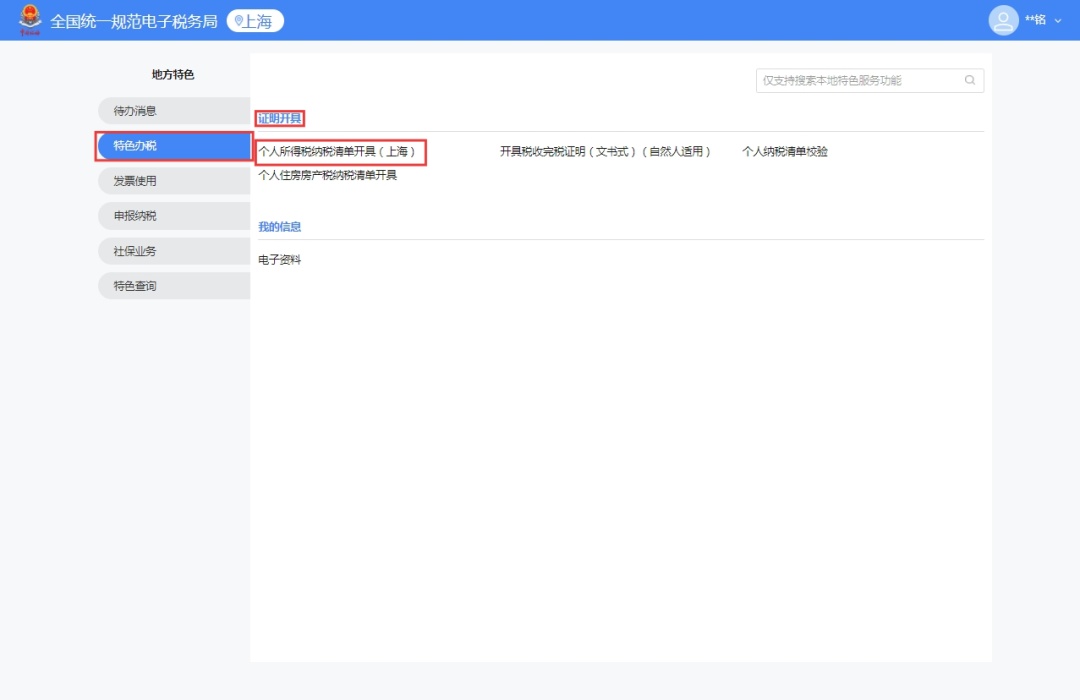 步骤2:登录成功后,直接搜索“个人所得税纳税清单开具”;也可依次进入“地方特色”-“特色办税”-“证明开具”-“个人所得税纳税清单开具(上海)”模块。