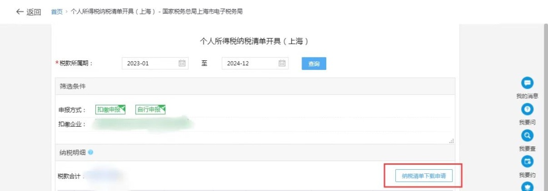 注意:“随申办”App暂不支持直接下载纳税清单PDF文件。如需下载,仍需前往电子税务局网站,在“已申请的纳税清单”模块中,选择申请日期进行查询和下载。