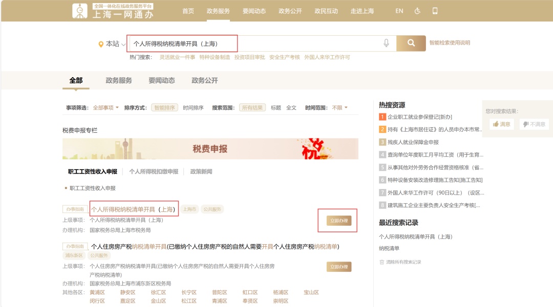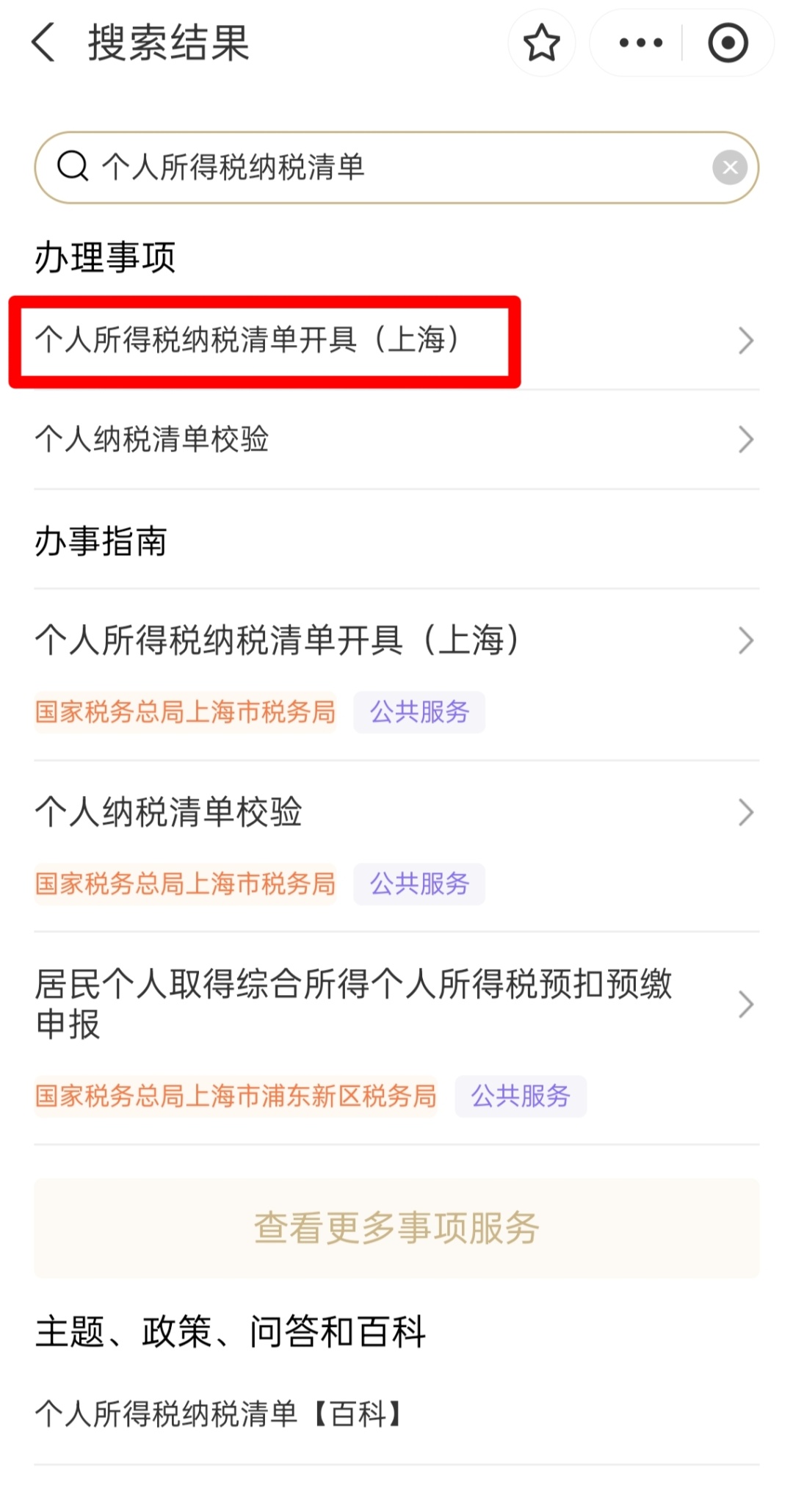 步骤2:搜索“个人所得税纳税清单开具(上海)”,即可跳转至电子税务局进行开具。
