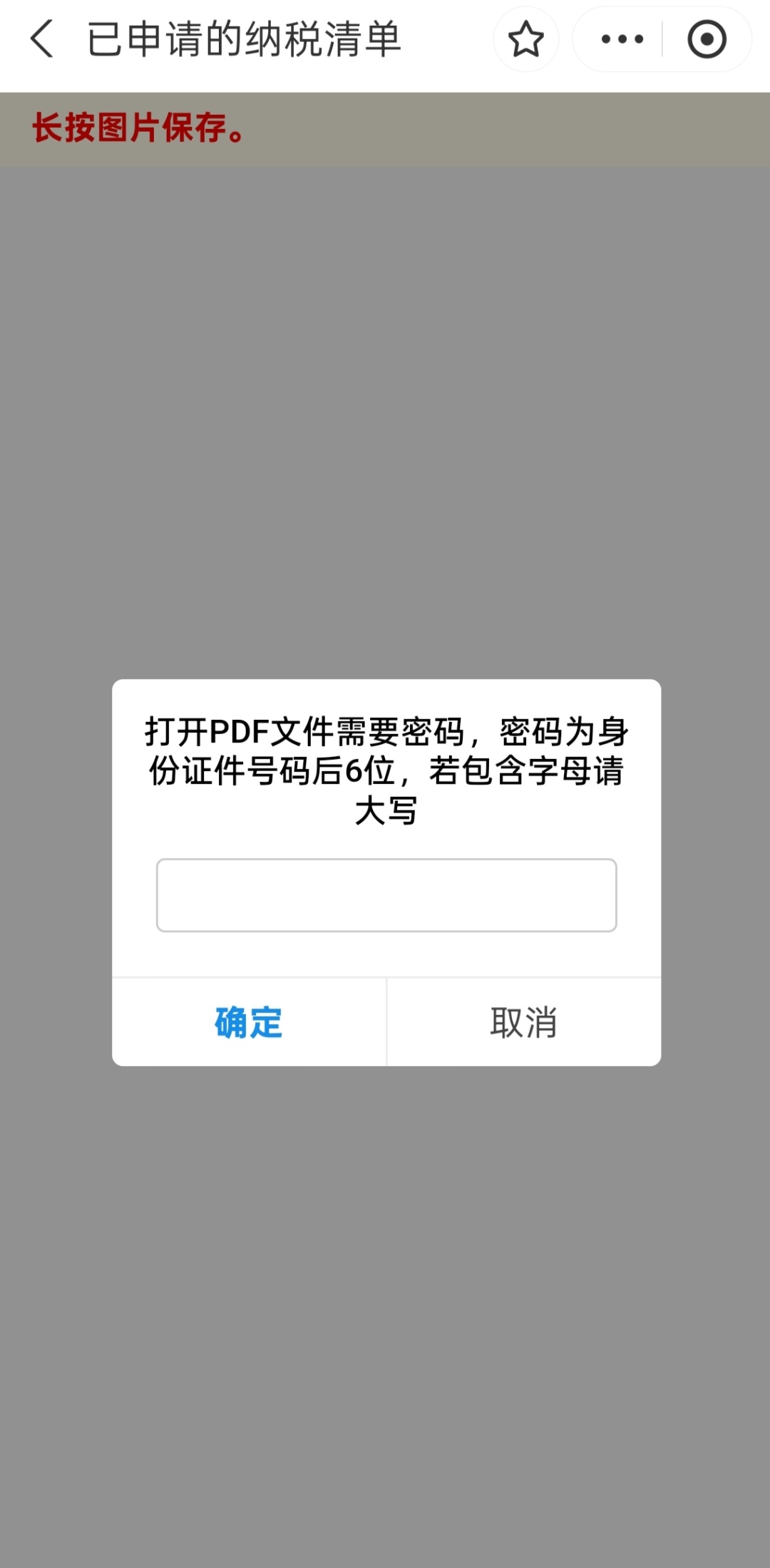 步骤4:打开文件:下载的PDF格式纳税清单文件需要密码打开,密码为身份证号码后6位(若包含字母,请大写)。