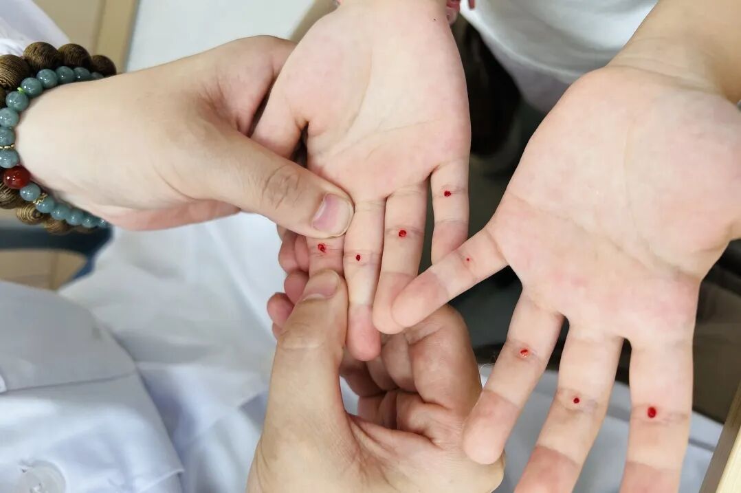 2.针刺四缝穴:取左、右手第二、三、四、五指掌面,近端指横纹中点的四缝穴,令患儿伸手,仰掌,局部皮肤消毒后,用三棱针点刺深0.5毫米,挤出少许淡黄色液体或少许血液,消毒干棉球拭干后按压片刻。针刺四缝穴每周1次,4周为一个疗程。