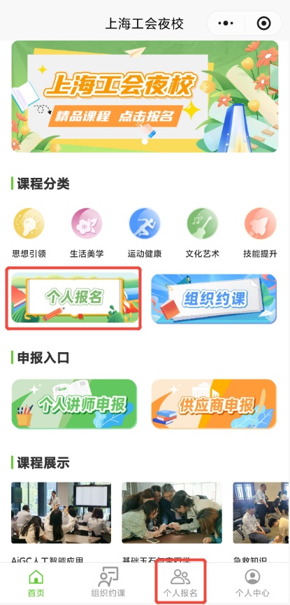 1.长按二维码进入“工会夜校”小程序,点击“个人报名”版块,同时底部导航栏也有单独入口;