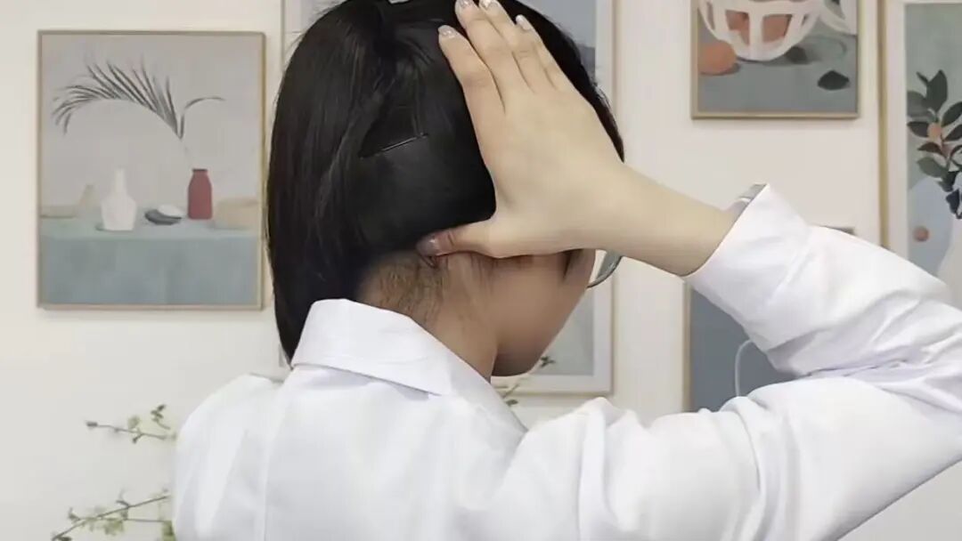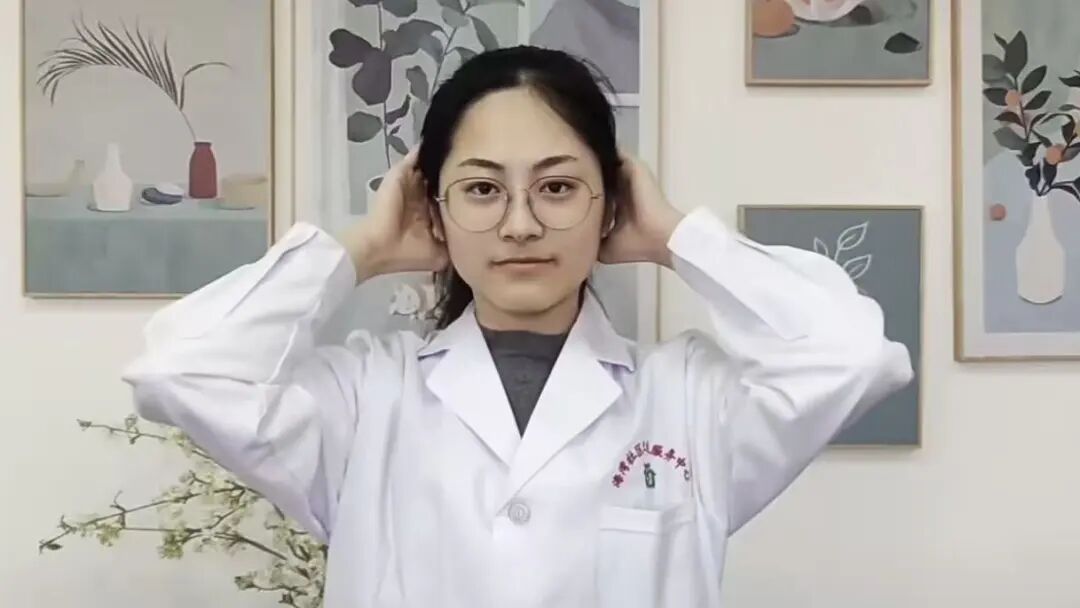 用自己的两手拇指抵住颈后的风池穴,其他手指固定在头顶部,右手拇指做顺时针揉按三圈,左手拇指做逆时针揉按三圈,重复十次;