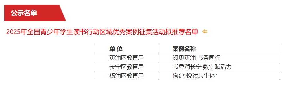 根据《教育部办公厅关于开展2025年全国青少年学生读书行动区域优秀案例征集活动的通知》(教基厅函〔2025〕23号)要求,拟在我市推荐3个青少年学生读书行动的区域优秀案例报送教育部。经组织专家进行材料审核,现定于2025年12月12日至12月17日将拟推荐名单进行网上公示。