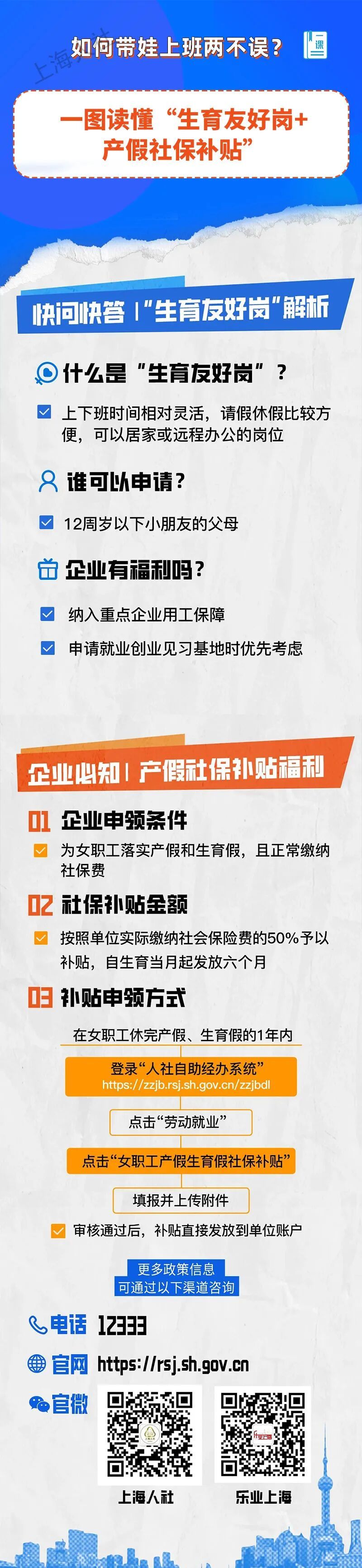 如何破解宝爸宝妈育儿与上班两难问题?本市人社部门为此推出了“生育友好岗”和“产假社保补贴”两项新政。一图读懂这套“组合拳”:
