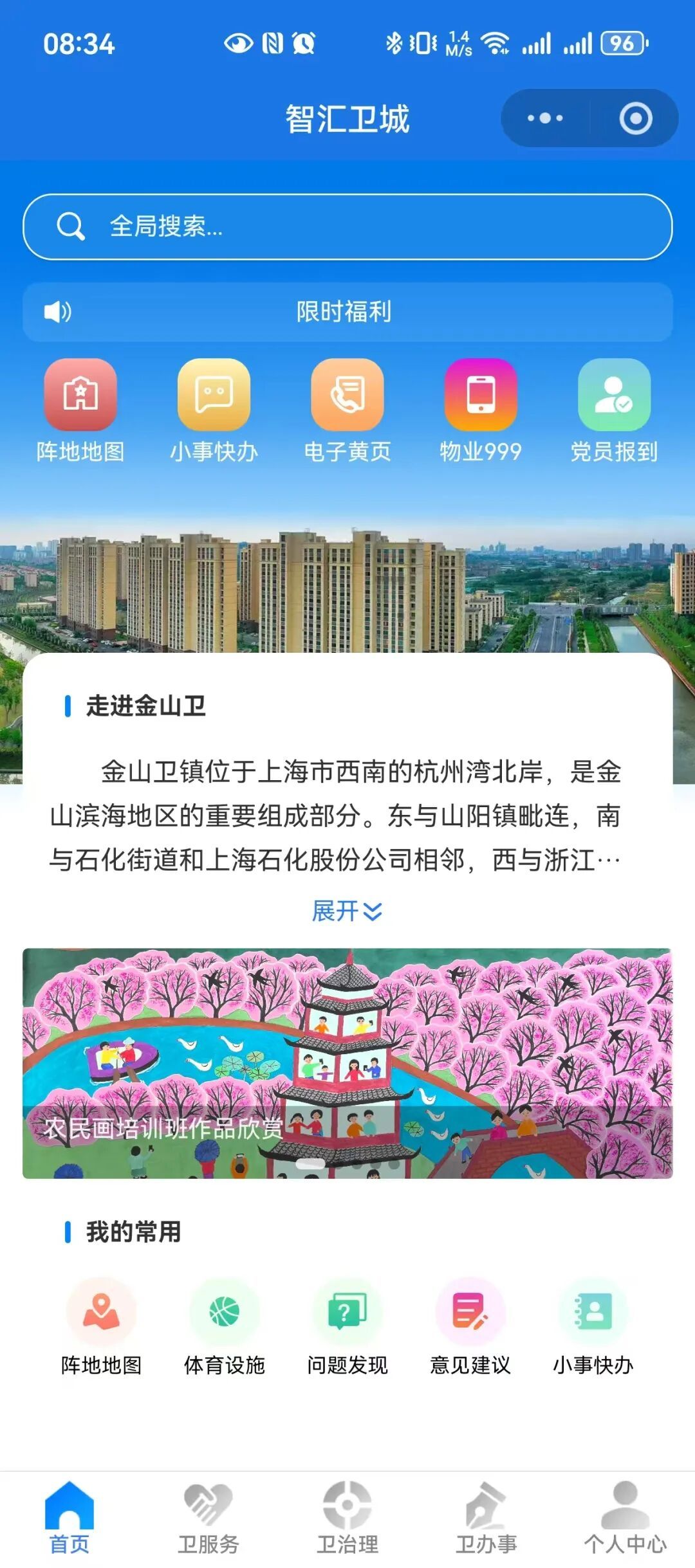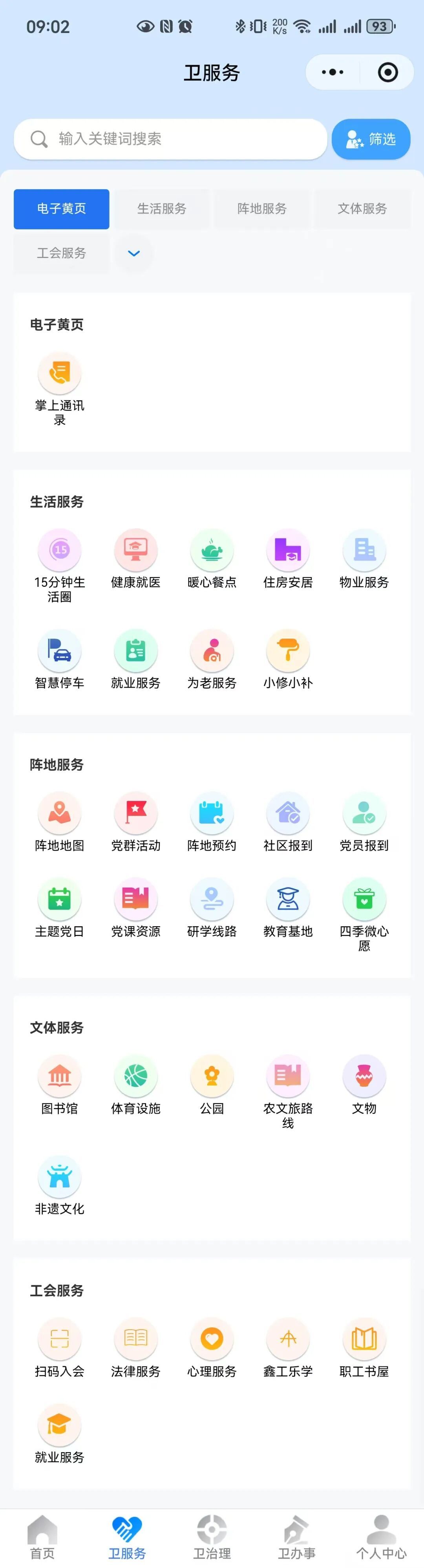打开全新改版上线的“智汇卫城”小程序,淡蓝色的操作界面上各功能分区清晰明了。首页增设了“全局搜索”模块,让办事群众仅靠关键词就能快速定位查询内容;“阵地地图”“小事快办”“电子黄页”“物业999”“党员报到”五个常用功能集合,为市民群众提供了诉求反映、阵地查询、热线直达、社区服务等便捷通道;在操作界面下方,卫服务、卫治理、卫办事三大核心模块分别聚焦民生需求、社会治理、政务服务进行了数据集成,构建起了“一站式、全场景、本地化”的服务体系。