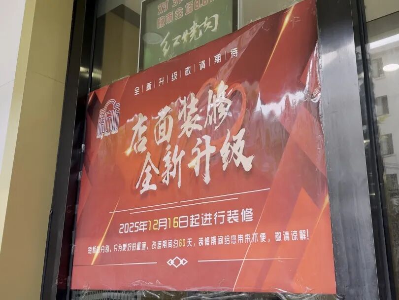 上午,记者在安顺路142号天山路街道社区长者食堂看到,社区食堂的显眼位置已经张贴了温馨提醒:2025年12月16日起,店面装修,全新升级。升级改造工期约60天。