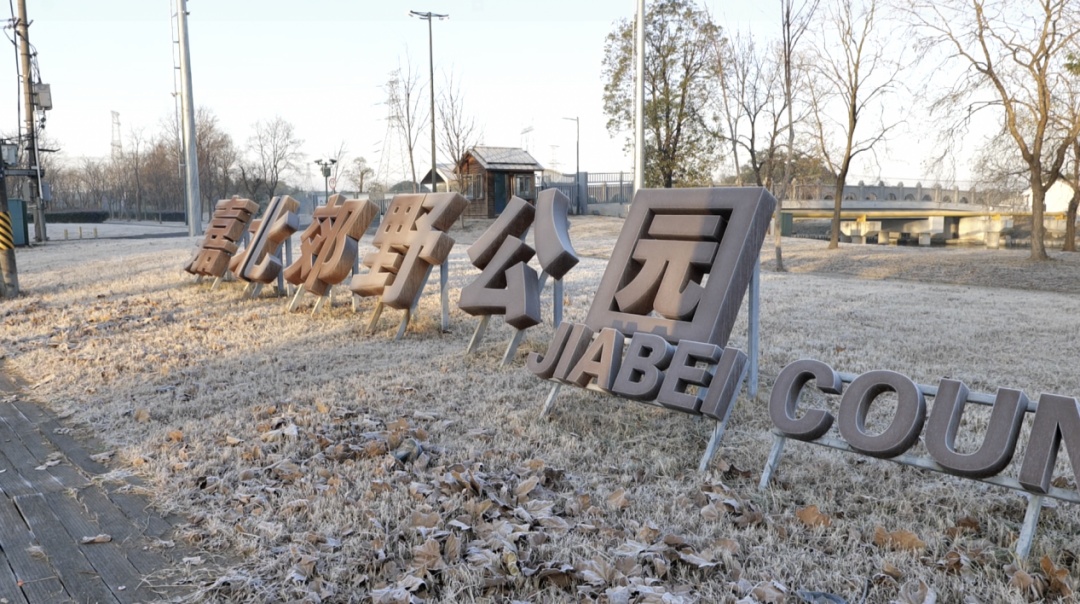 沿着嘉安公路继续前进,便来到了嘉北郊野公园。门口的标牌也覆上了匀净的霜,木质纹理在霜下隐约浮现。