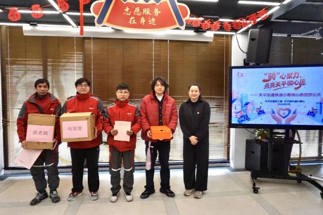 近日,徐汇区天平街道在66梧桐院党群服务中心开展“‘骑’心聚力,点亮快递小哥微心愿”圆梦活动,通过街区党支部与群团组织联动,携手爱心企业为13位新就业群体送上暖心关怀,让奔波在城市一线的快递小哥感受到属地温暖。