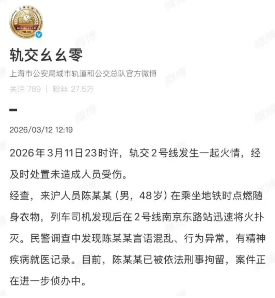 3月12日,上海市公安局城市轨道和公交总队官方微博发布最新通报: