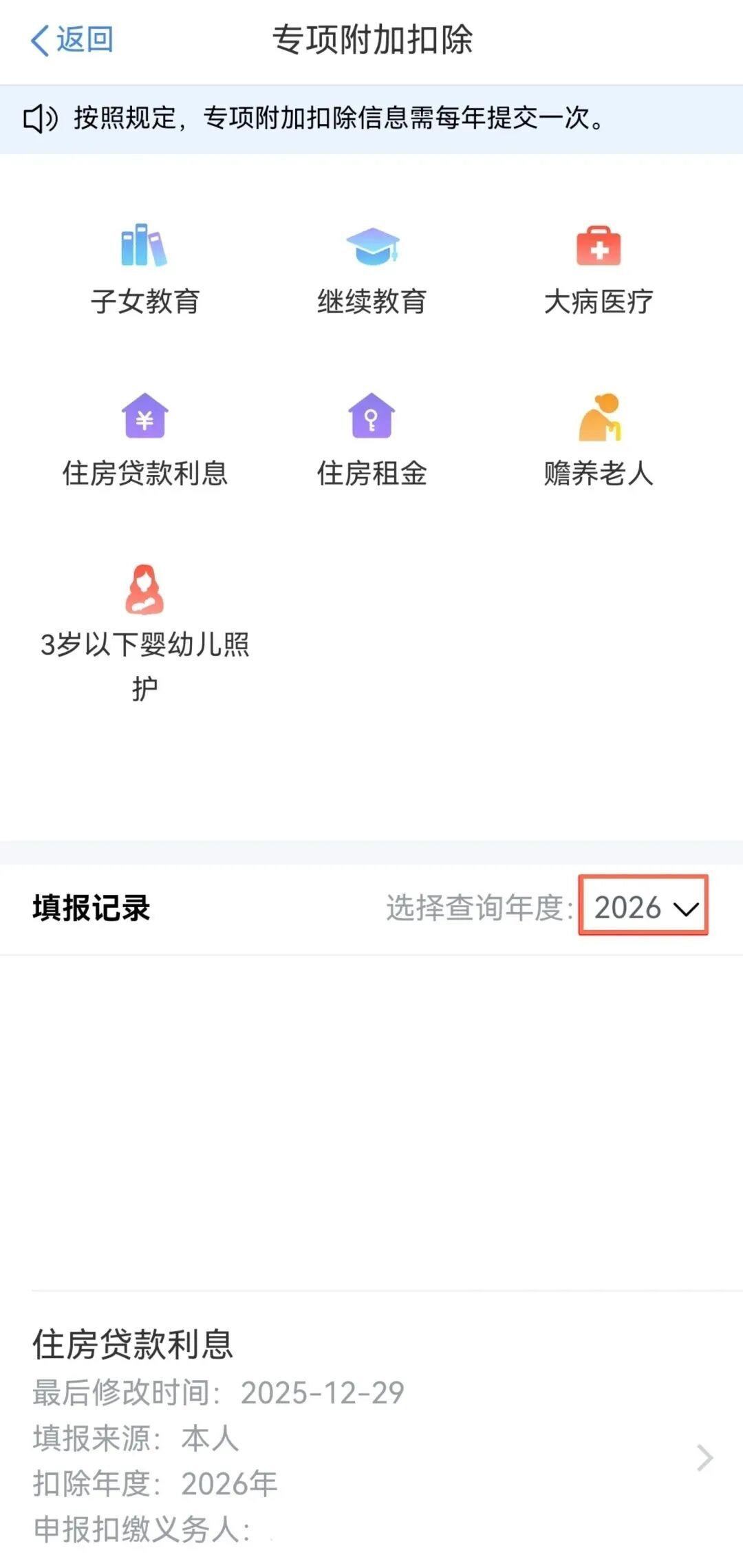 选择查询年度并找到已经填写的专项附加扣除信息,点击右下角【修改】后选择【修改申报方式】。