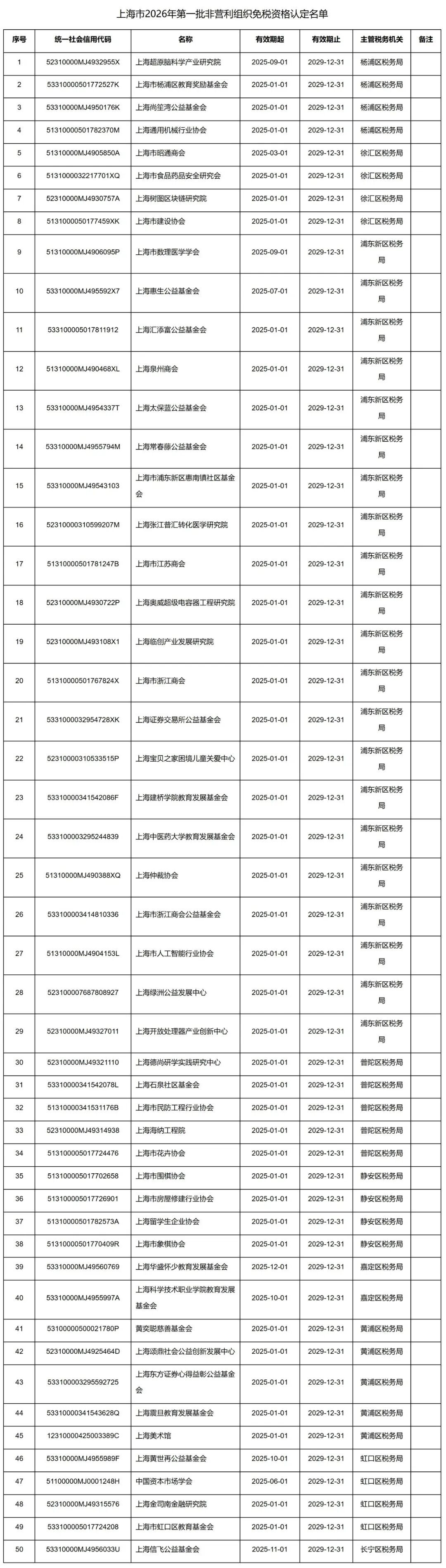 上海市2026年第一批非营利组织免税资格认定名单