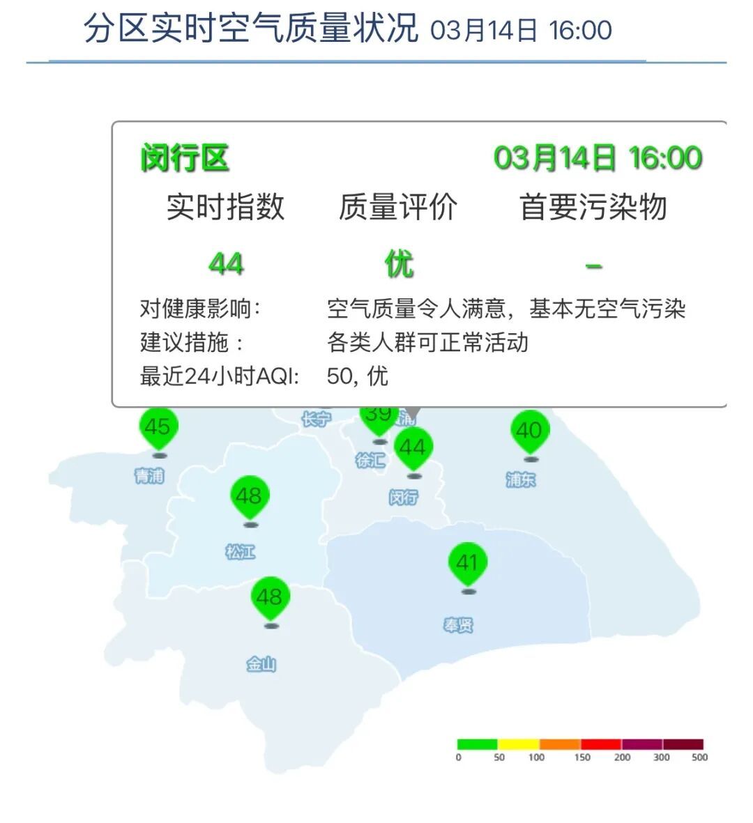 闵行区AQI为44,优。