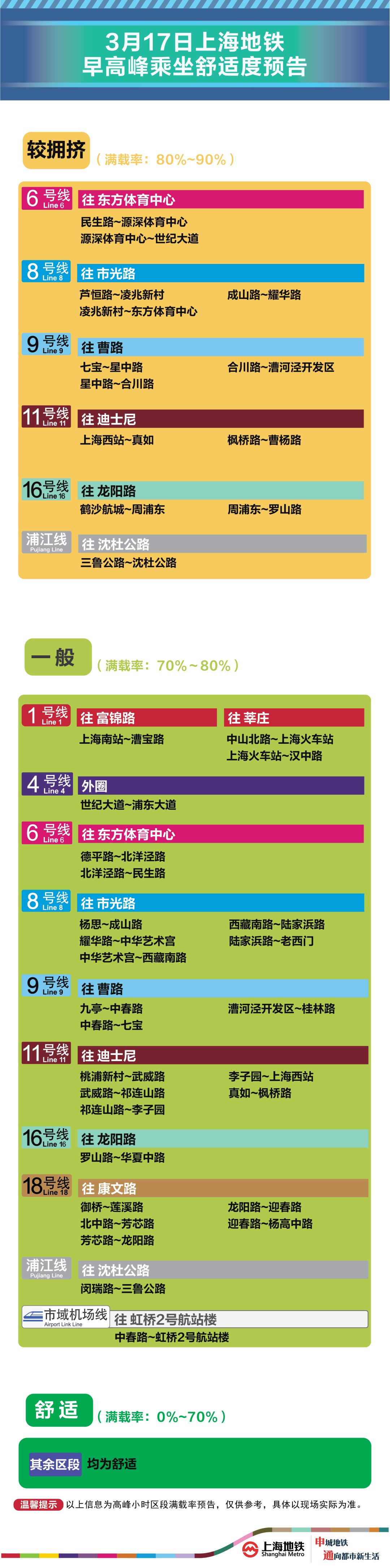 为提升上海地铁早高峰期间出行服务水平,提升乘客乘坐体验,上海地铁向乘客提供乘坐舒适度预告,方便乘客提