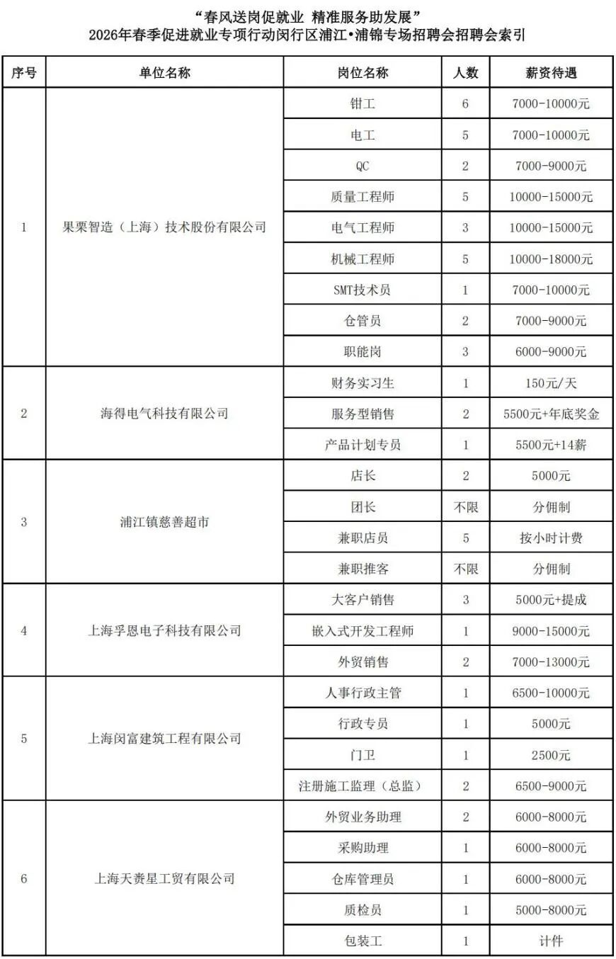 为进一步搭建求职者与企业供需平台,助力高质量就业与企业稳健发展,定于2026年3月21日开展2026年春季促进就业专项行动闵行区浦江·浦锦专场招聘会。 招聘会信息 招聘会时间:2026年3月21日(星期六)12:30—14:30 招聘会地点:上海浦江万达广场3号门(永跃路360号)