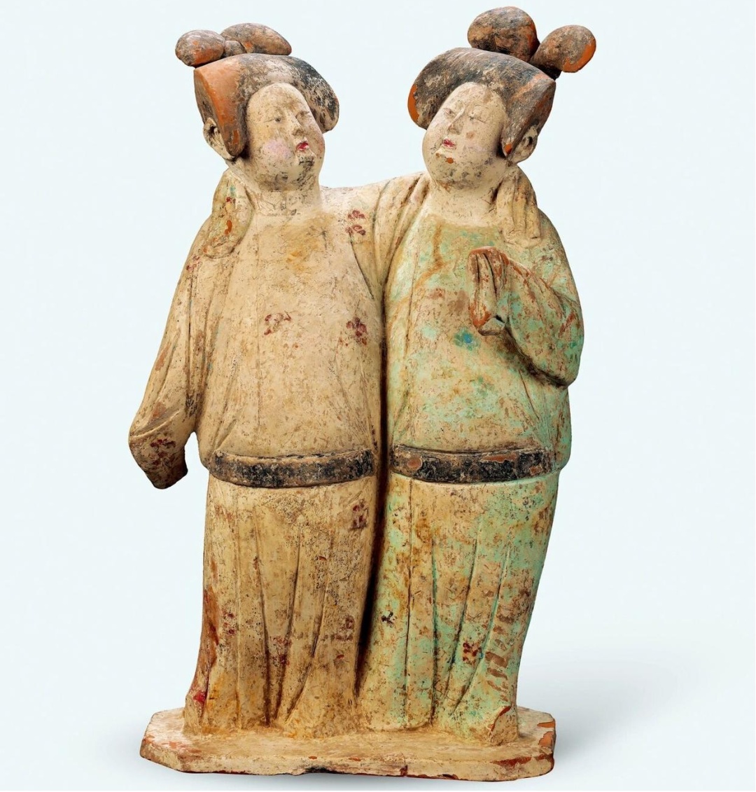 唐 彩绘连体侍女灰陶俑