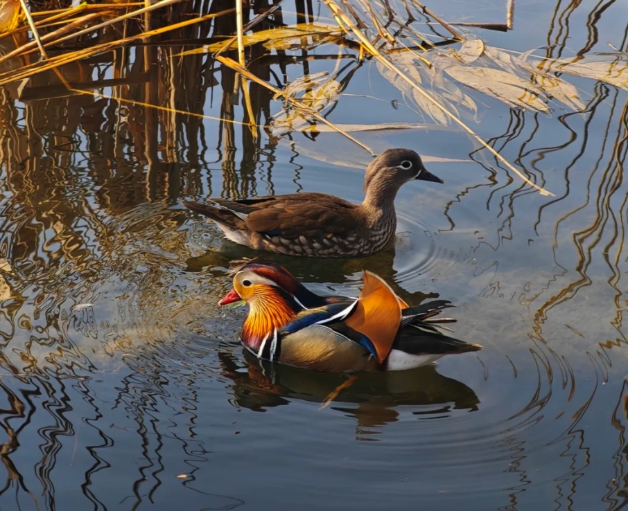 湖面上游着一对鸳鸯