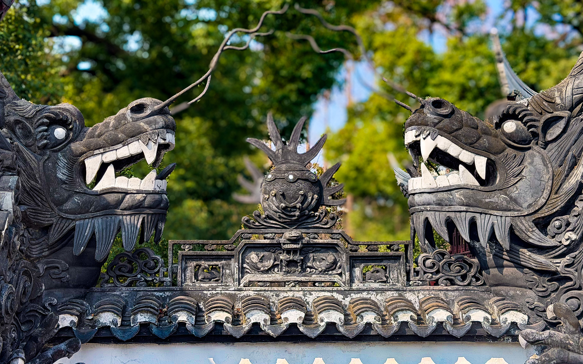 龙墙的龙头用泥塑而成,龙身以青瓦拼作鳞片,在白墙之上起伏翻腾,似欲腾空。其中最醒目的是"穿云龙",位于点春堂西侧,龙首威武,龙身蜿蜒如穿云而过,最具动感。与之相对的"双龙戏珠",两条龙共戏一颗宝珠。在中国古代神话中,龙珠是龙的精华所化,双龙戏珠象征人们对吉祥平安、美好生活的追求。一墙之上三龙齐聚,在民间园林中极为罕见。