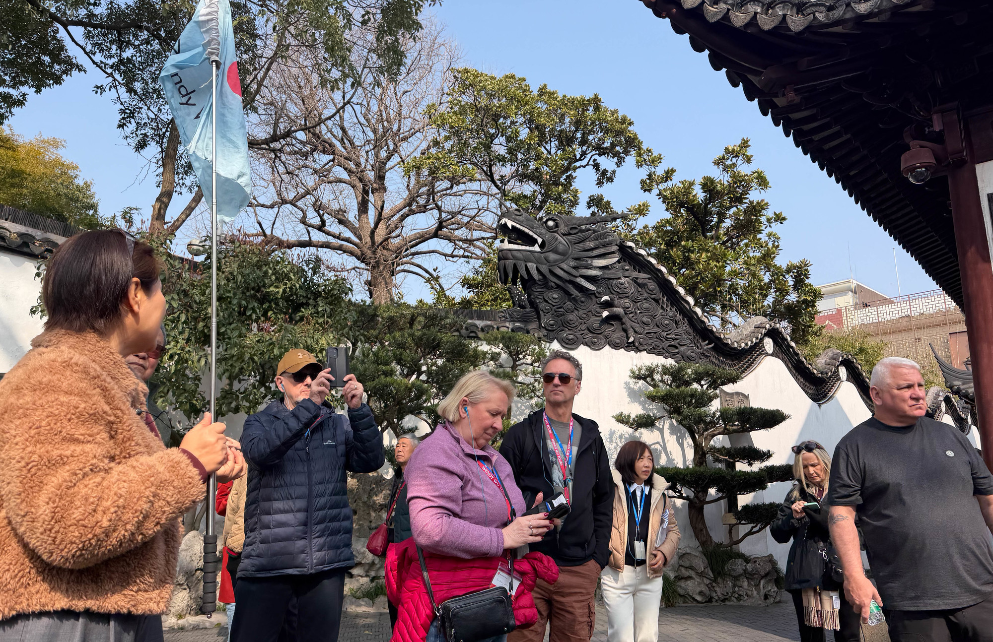 3月20日上午9时,一个国外旅行团正在豫园“龙墙”前参观