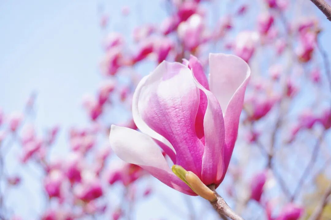 走出九科绿洲,沿着中心路前行,又是一番别样的春日景致。道路两旁的玉兰花迎风怒放,硕大的花朵亭亭玉立,花瓣温润如玉,有洁白如雪的纯净,也有淡紫如霞的温婉,无需绿叶衬托,便自带高雅气质。阳光洒在花瓣上,透着淡淡的光晕,远远望去,像是枝头停满了展翅欲飞的玉蝶,高贵又灵动。