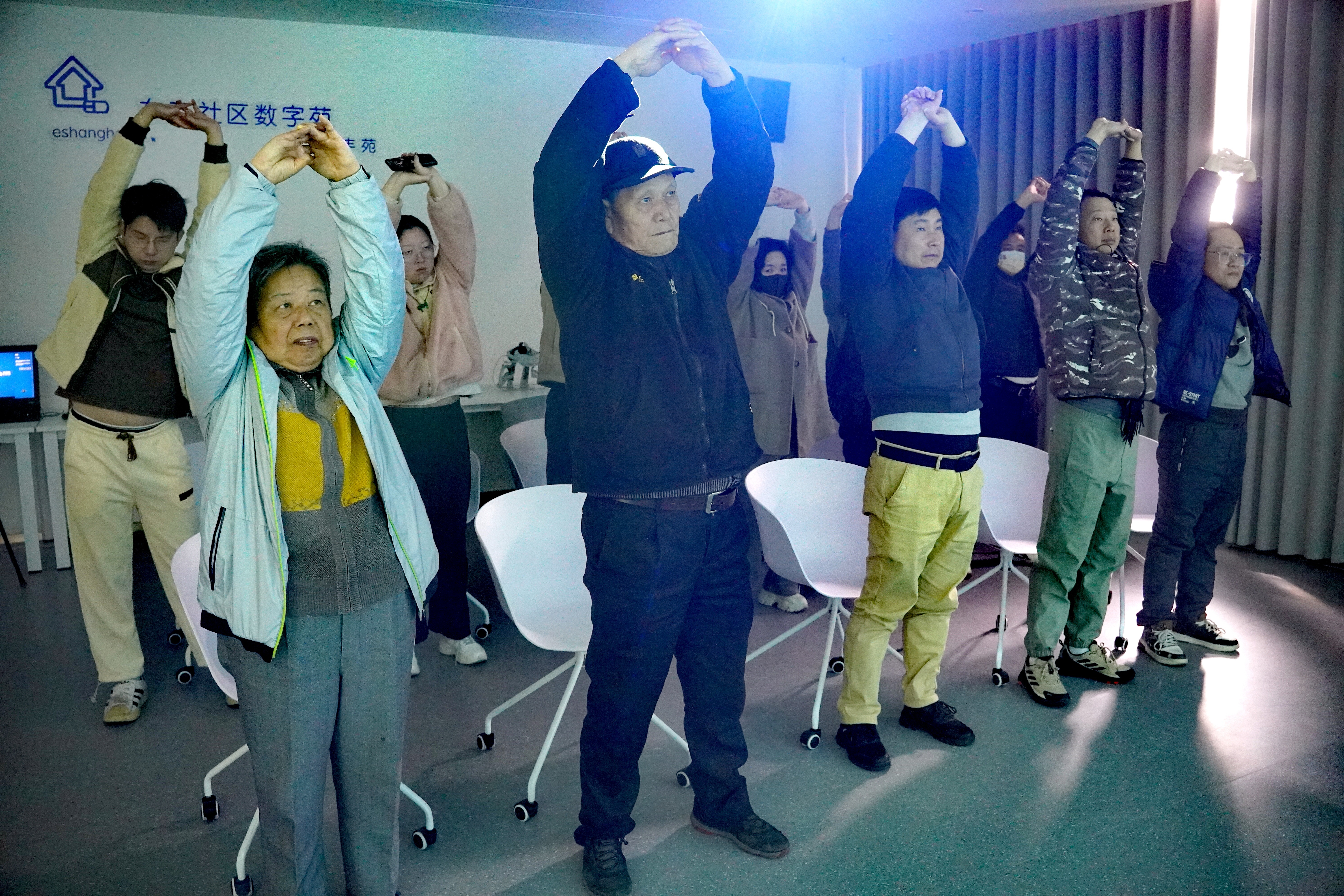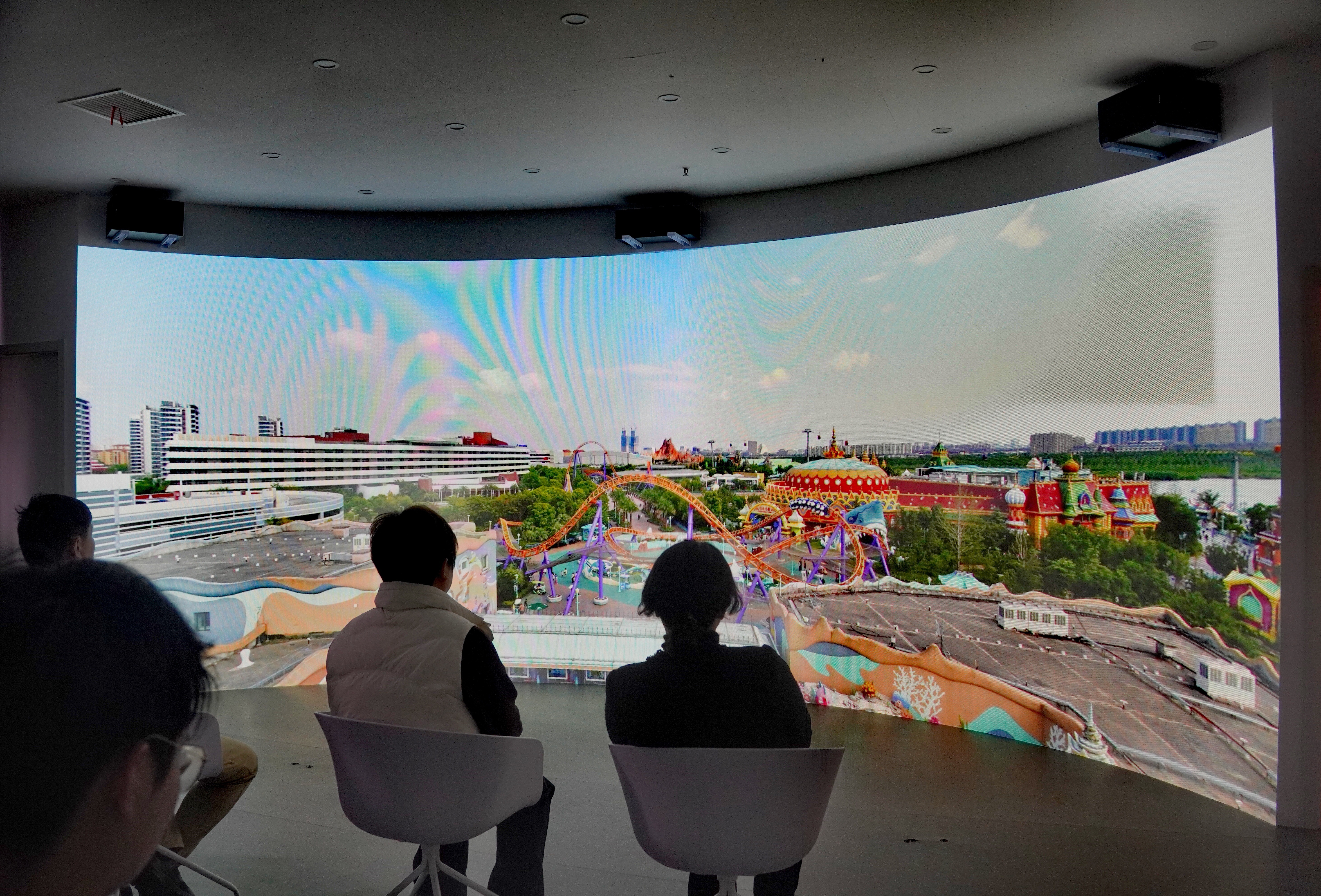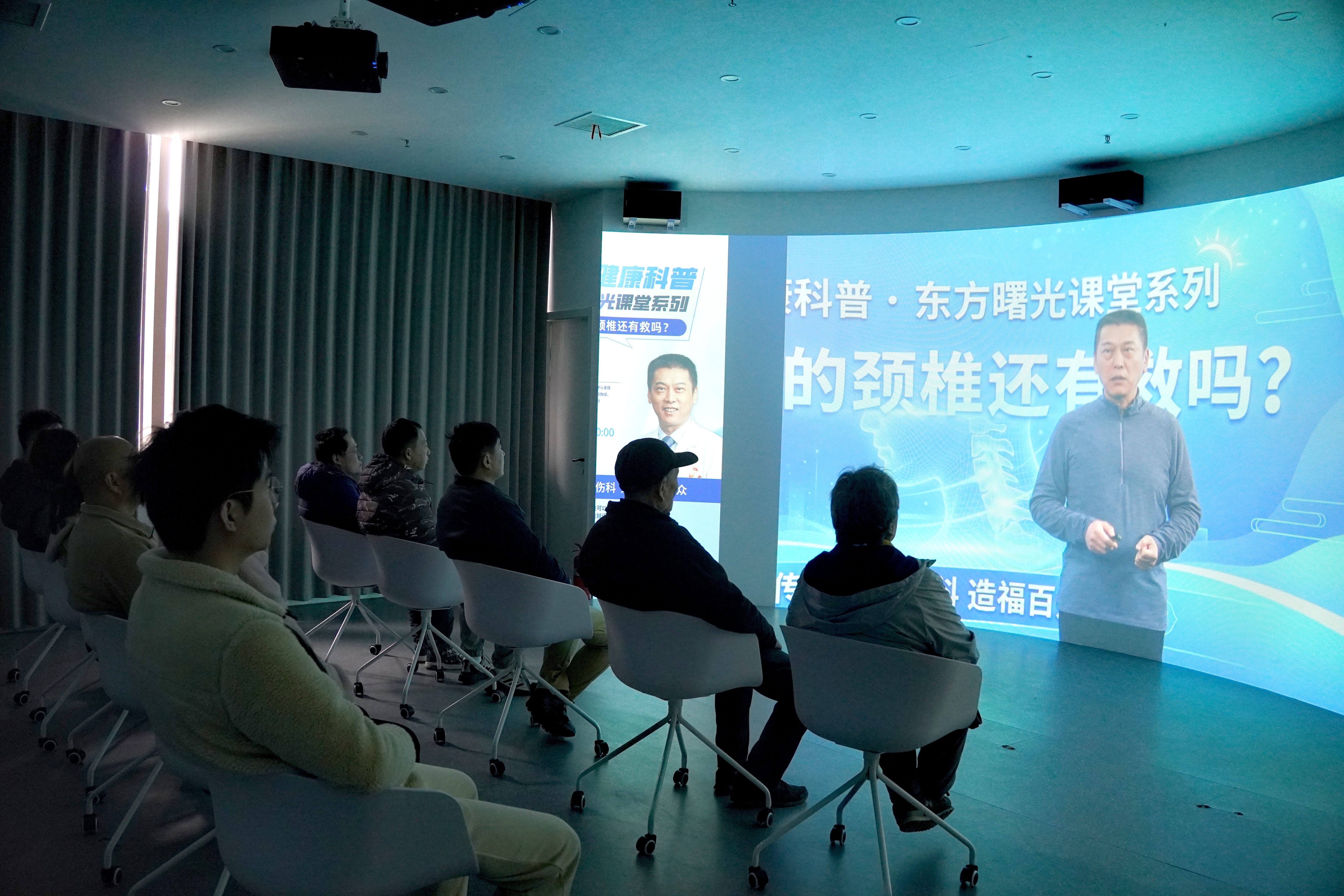 宽敞的视听馆内,一面巨大的环抱式曲面屏幕从地面延伸至天花板。当天上午10时,讲座准时开播,柔和的氛围灯缓缓亮起。10名市民坐在人体工学椅上,脚下是深灰色吸音地毯,身后配备AR视听设备与电脑终端。大屏幕上,上海市慢性筋骨病临床医学研究中心主任詹红生动讲解健康知识,人体颈椎的骨骼结构、血管流动的三维动画图清晰呈现。科普完坐姿调整、枕头选取等实用内容后,大家纷纷起身,跟着专家做起颈椎操。