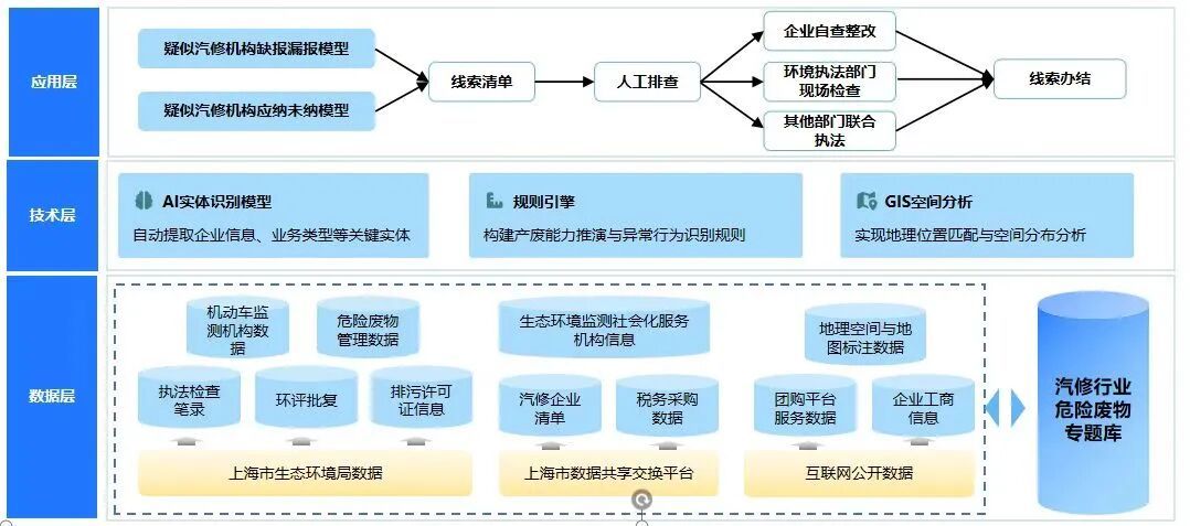 针对汽修机构危废管理责任意识不强的痛点,采用“多源数据融合+人工识别+空间匹配”路径,通过整合地图招牌识别、团购服务项提取与工商信息比对,确认机构实际开展机油保养或喷漆相关业务但未纳入危废系统,实现隐匿产废源自动筛查。针对已纳管企业多年不申报、逃避危废依法转移的监管盲区的痛点,采用“历史数据回溯+规则引擎+执法证据关联”路径,通过比对历年申报记录、排污许可登记种类与近三年执法笔录中“喷漆烤房”“废矿物油贮存”等关键词,构建申报异常识别模型,锁定连续两年无申报但持续经营的高风险主体。