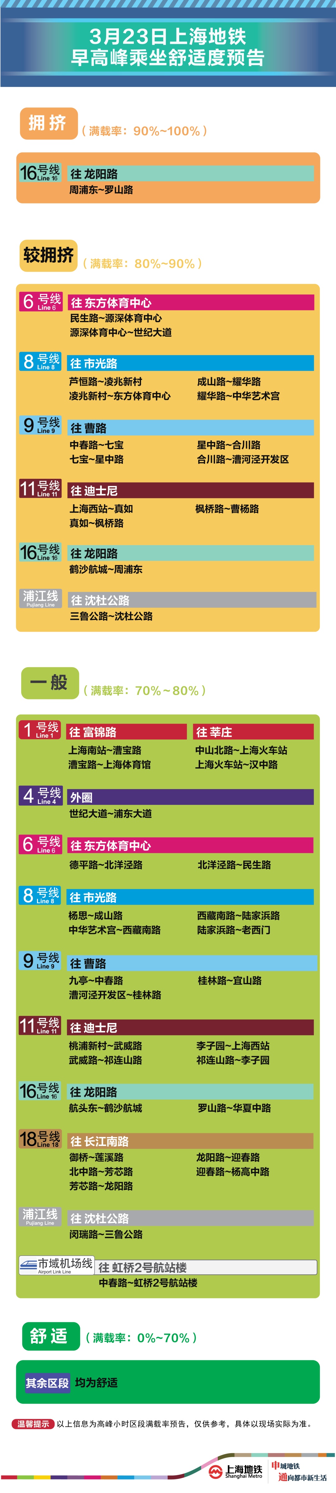 为提升上海地铁早高峰期间出行服务水平,提升乘客乘坐体验,上海地铁向乘客提供乘坐舒适度预告,方便乘客提
