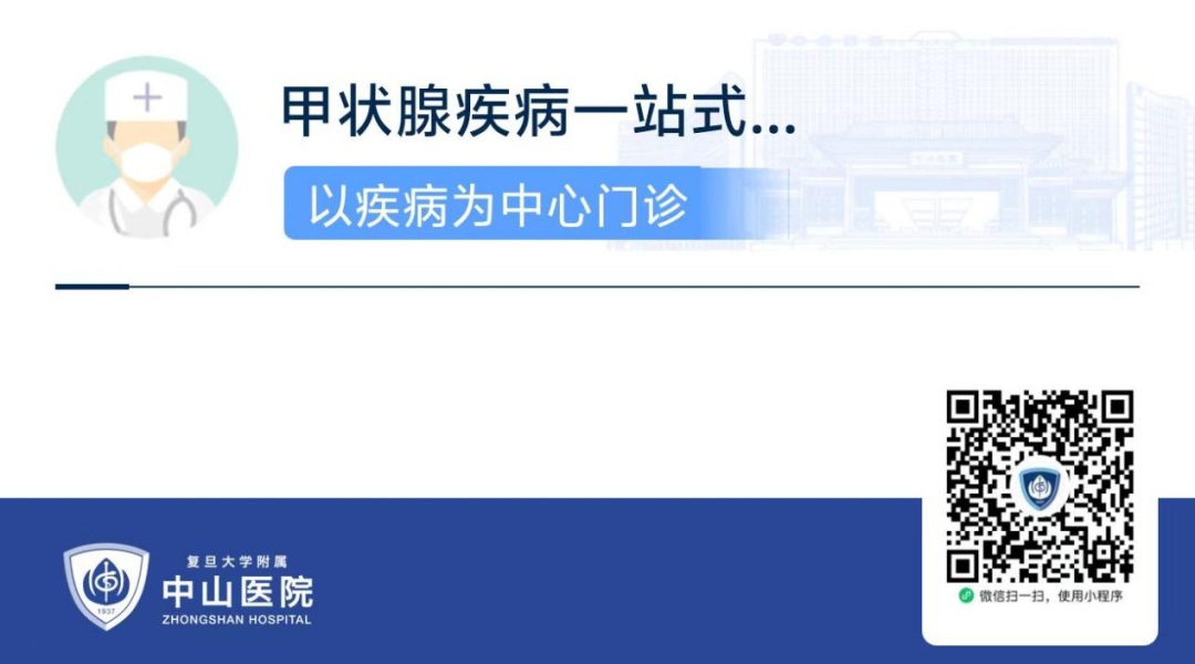 关注“复旦大学附属中山医院门诊服务”微信公众号,点击“门诊服务”,选择“门诊预约”—“以疾病为中心门诊”,点击“甲状腺疾病一站式门诊”进行预约。