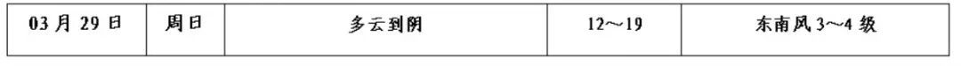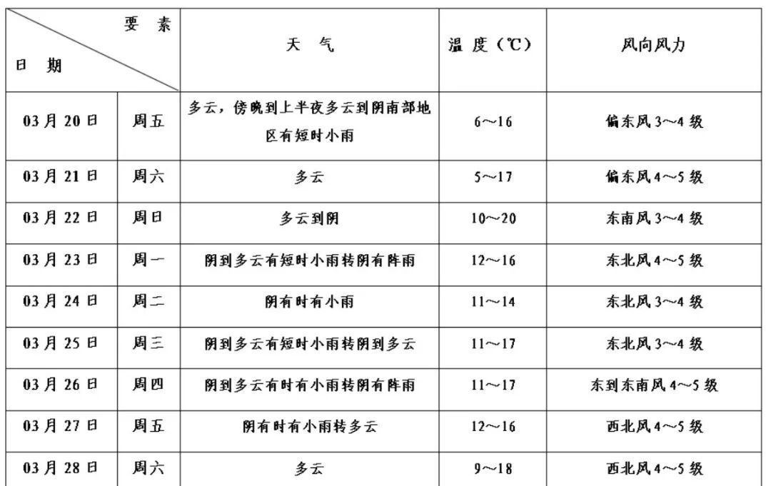 周六:多云,7—17℃。偏东风4—5级,相对湿度95%—50%。