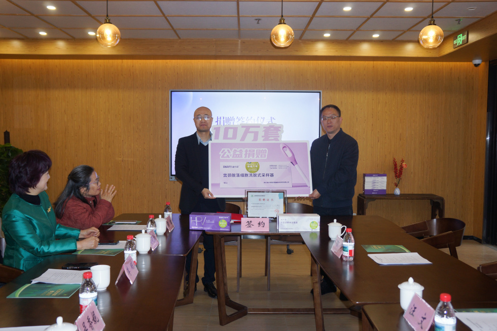 3月20日上午,“幸福万家”女性公益筛查项目走进浦东捐赠仪式在浦东社会创新示范园举行,标志着该项目在浦东新区正式进入实施阶段。国控医康科技(上海)有限公司向浦东新区社会发展基金会捐赠10万份居家宫颈脱落细胞洗脱式采样器及筛查服务。