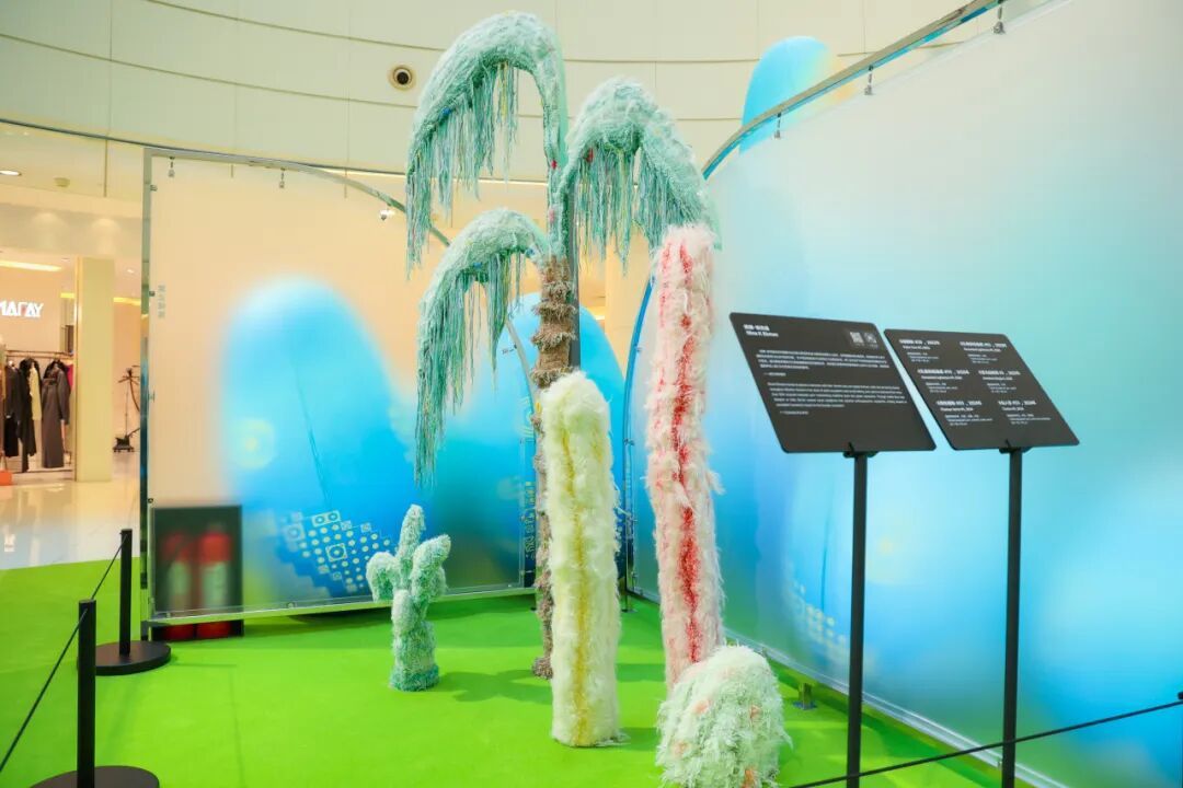 挪威艺术家Nina K Ekman带来的纺织雕塑,远看像一团团鲜活的绿,近看却藏着对生态的哲思。她用90%的纺织厂库存纱线,扎出棕榈树、仙人掌、亚马逊植物——有的蓬勃舒展,有的垂顺弯曲。