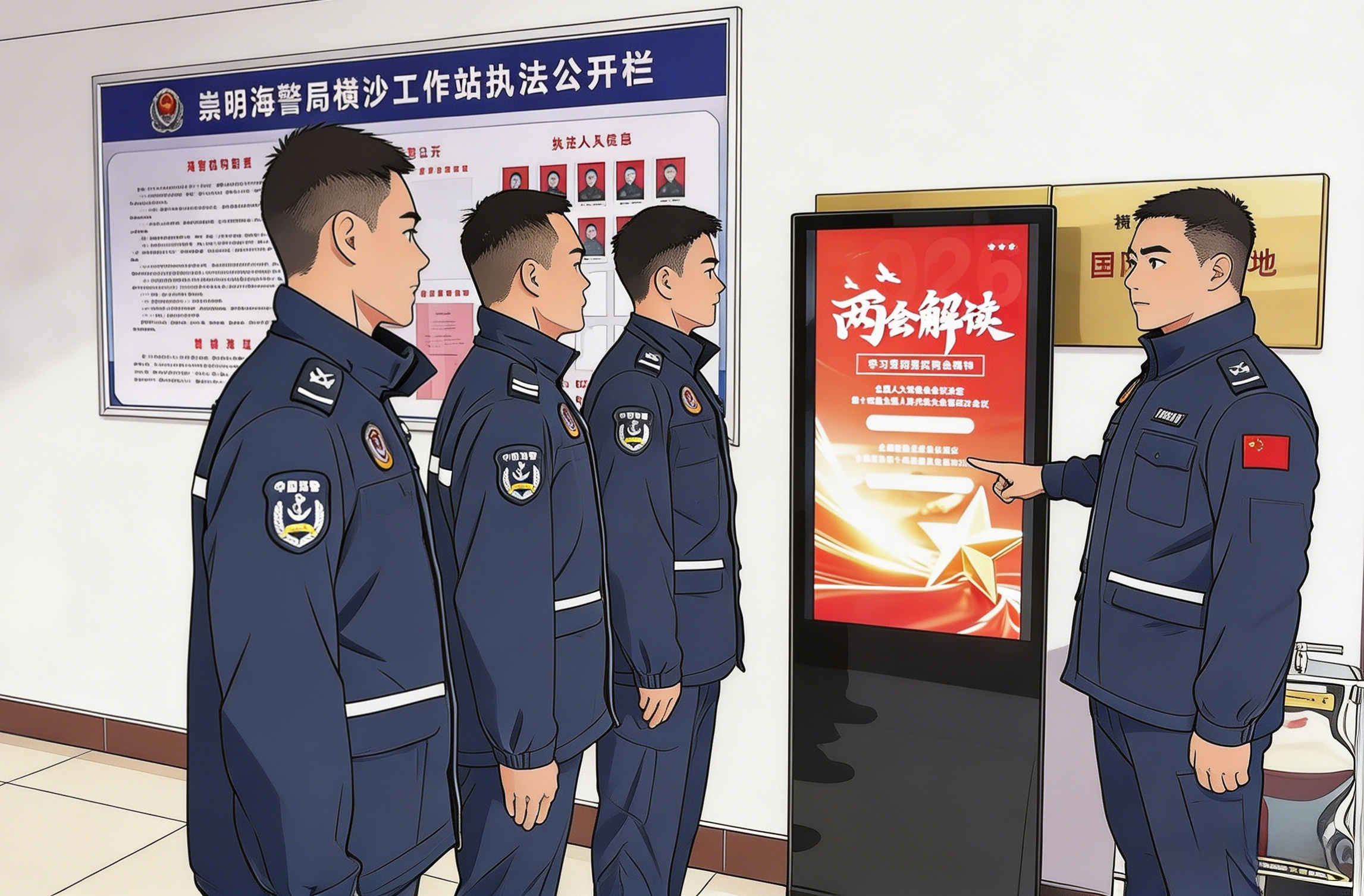 春风拂过东海瀛洲 全国两会闭幕的号角 正转化为崇明海警局执法员奋进的鼓点 从营区课堂到甲板浪尖 从理论学习到执法实践 他们以多种形式深学细悟两会精神 在万里海疆书写着忠诚履职的新篇章 今天,让我们通过一组漫画 感受崇明海警学贯两会的火热场景 “三个半小时”传统不褪色 晨光里 执法员们早早围在电视机前 等待盛会开幕 油墨清香伴着海风 执法员手捧报纸 逐字逐句学习两会报告原文 将“十五五”蓝图深植心间 崇明海警局“浪尖小课堂”开讲了 舰艇甲板、办案场所 理论骨干正在解读两会精神 大家结合海上维权执法实际 谈体会、话使命 依托“教育平板”和“电子展板” 碎片化时间也能高效学习 热词解读、报告金句 动动手指“一键直达” 让理论学习带着“海味”、冒着“热气”。 贯彻两会精神 就是要在维权执法的第一线 敢跳帮!勇亮剑! 作为长江口生态屏障的守护者 “瀛海卫士”面对恶劣海况从不退缩 他们将学习焕发出的政治热情 转化为忠诚履职的强大动力 无论风急浪高 始终坚守在维权执法一线 守好长江入海口 两会《政府工作报告》中提到 让人民群众身边的山更绿、水更清 崇明海警局全力打造 “瀛海卫士”生态警务品牌 联合10余家涉海单位 从打击非法捕捞 到保护中华鲟栖息地 用法治力量守护一江碧水 筑牢长江口生态安全屏障 作为新时代“海上枫桥”经验践行者 他们把“为民服务”理念刻进心间 渔民受伤,第一时间登船急救 船舶纠纷,耐心调解化干戈 一次次紧急救助 一趟趟普法宣传 执法船渐渐成为群众心中的连心船 蓝图已绘就 奋进正当时 崇明海警局全体执法员 将持续深学细悟两会精神 以“瀛海卫士”之名 铸忠诚之魂,守一方安澜 在长江入海口书写无愧于时代的崭新答卷