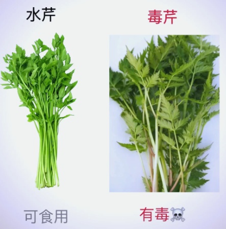 毒芹:外形酷似水芹,全株有毒,误食后会引发恶心、呕吐、呼吸困难等中毒症状。