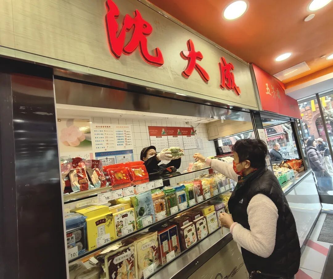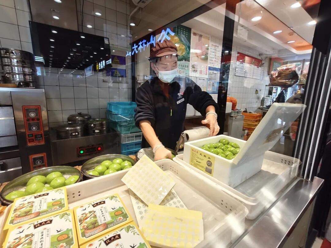不远处的沈大成摊位前,同样一派忙碌。师傅们采用传统生坯现蒸模式,将新鲜的青团皮与馅料直接包裹,放入蒸笼后仅需十几分钟即可出炉。多位老顾客表示,每年清明时节都会专程前来购买,家中老人孩子都十分喜爱。今年沈大成还创新推出春三鲜、鲜肉粢毛团等咸口新品,工作人员介绍说:“如今偏爱咸口青团的消费者逐年增多,新品上市后销量持续走高。”