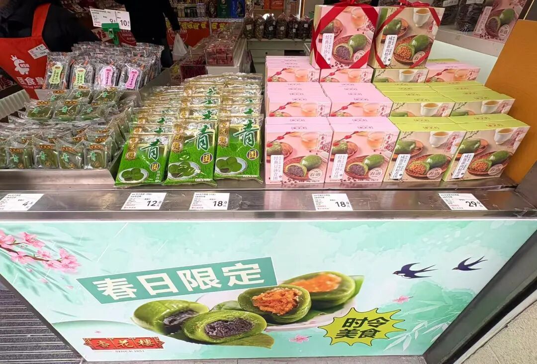 时令美食青团迎来销售旺季,徐家汇商圈的汇联商厦内,白玉兰、沈大成、杏花楼等一众老字号齐聚一堂,各式青团新鲜上架。刚出炉的青团香气扑鼻,现做现卖的热闹场景,吸引众多市民排队购买。