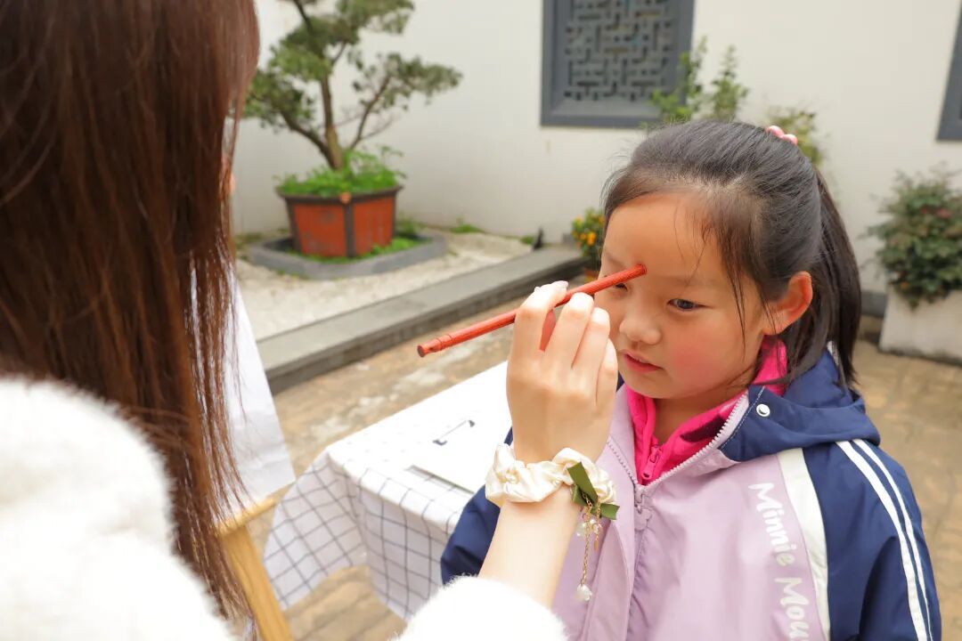 现场,孩子们在家长的陪伴下,以“正衣冠、点朱砂”的传统方式开启当天的文化之旅。这一仪式象征着孩子正式开启学业,也契合了龙抬头“开笔破蒙”的古老习俗。