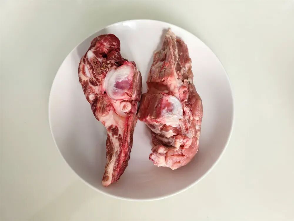 猪脊骨也叫猪龙骨、猪腔骨,自猪的第五、第六胸椎间至腰椎第四处锯断,并取出背最长肌,表面肉色呈鲜红色的骨头。骨头占比较高,肉相对少,肉质口感偏紧实,也就是常说的“有点柴”。