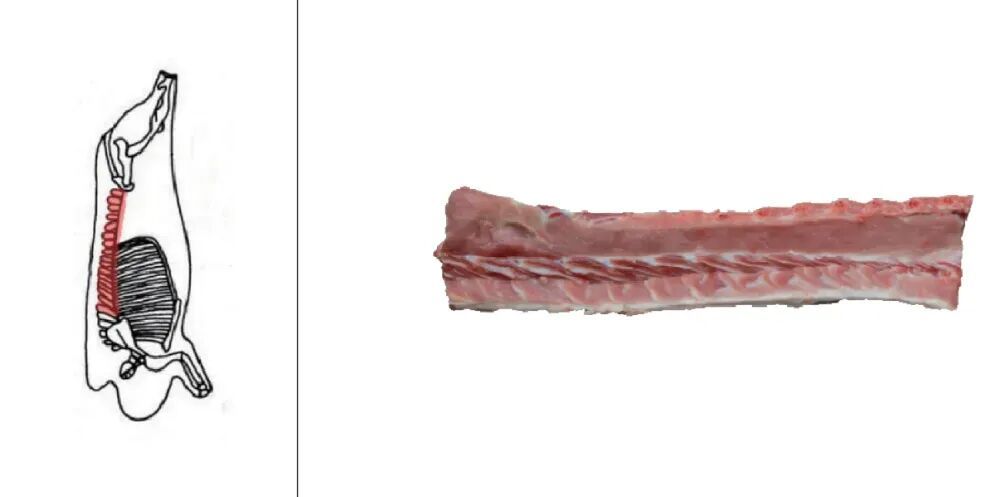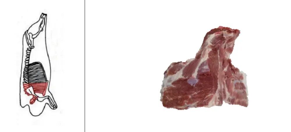 取自猪第五、第六椎间至颈椎部位脊骨,去除颈背肌肉,带胸骨和五根肋骨的部位肉。猪小排则是猪前排有肋骨部位,带肋骨 5 根~6 根,去脊椎,硬胸骨,呈“A”字形的部位肉。猪前排往往会带一点软骨、筋膜和更复杂的骨边结构,肉不算厚,但口感很丰富,既有肉香,也有软骨的脆嫩。