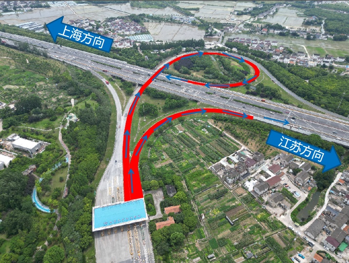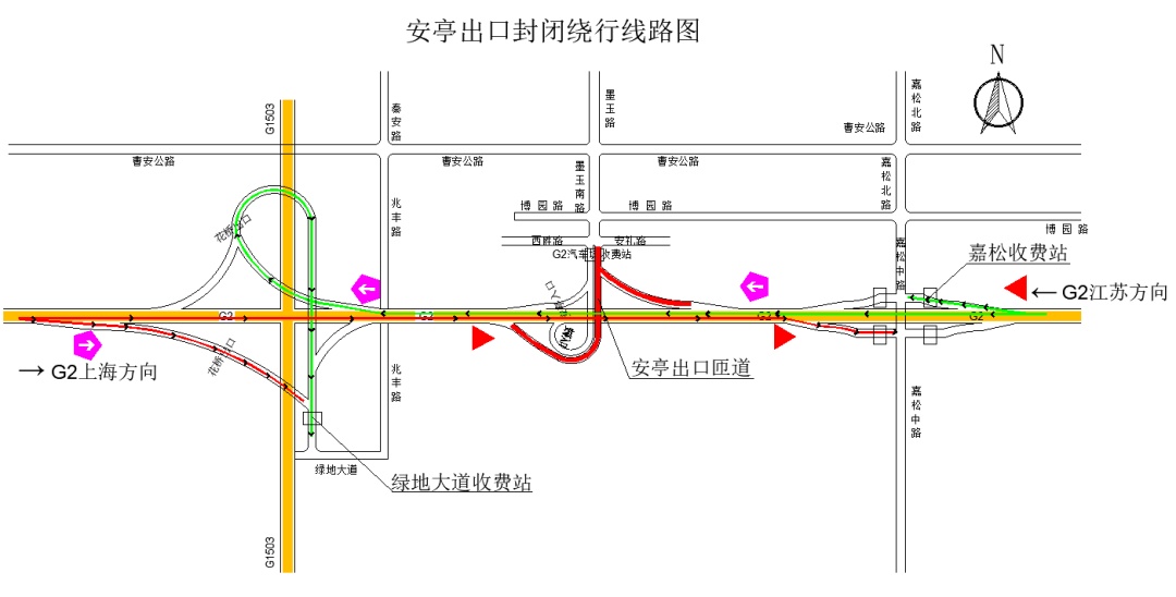 入口匝道封闭施工期间通行车辆可通过如下线路绕行绿地大道、嘉松收费站进入高速主线: