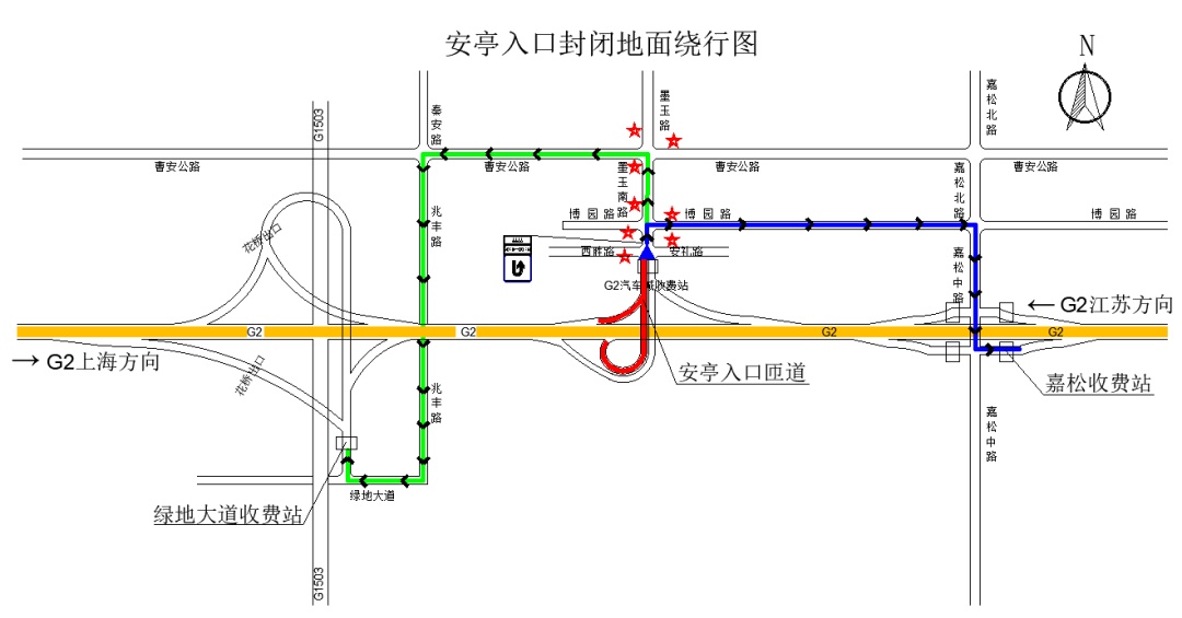 1.绿地大道收费站绕行线路:安亭入口→墨玉南路→曹安公路→兆丰路→绿地大道→绿地大道收费站入口
