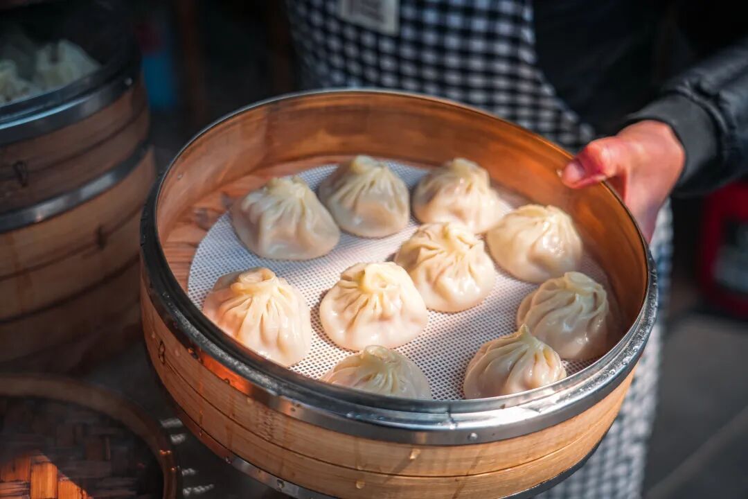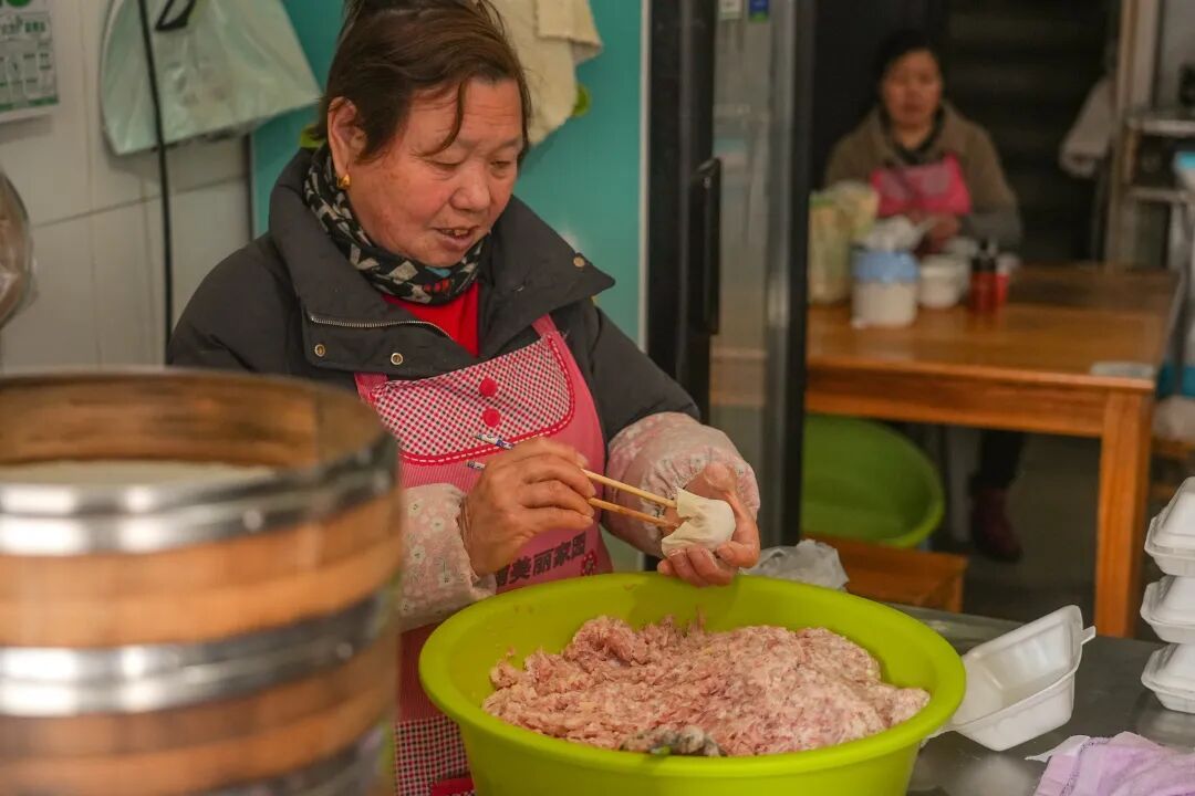 清晨五点半,新溪路在晨曦中醒来。玉兰面店的老板娘已经揉好了面团。这家开了几十年的老店,店面不过十来平米,几张木桌被岁月磨得发亮。老主顾们不用看菜单:“老规矩,大排面加一份小笼。”老板娘应一声,厨房里便响起滋啦的炒肉声。他们家的小笼和烧卖更是许多老角里人的乡愁。她的烧卖皮子是自己擀的,中间厚边上薄,蒸出来呈半透明,隐隐透出里面的肉馅。