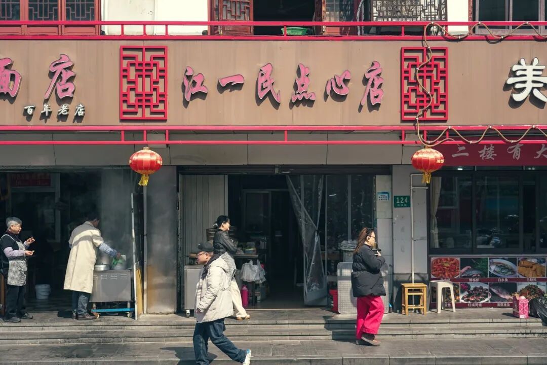 玉兰面店旁边就是江一民点心店。这里的生煎也是无数角里人儿时的味道,底儿焦脆,咬开一小口,滚烫的汤汁溢出来,咸中带甜,是老底子酱油和肉皮冻熬出来的鲜。就着一碗辣肉面,满足!