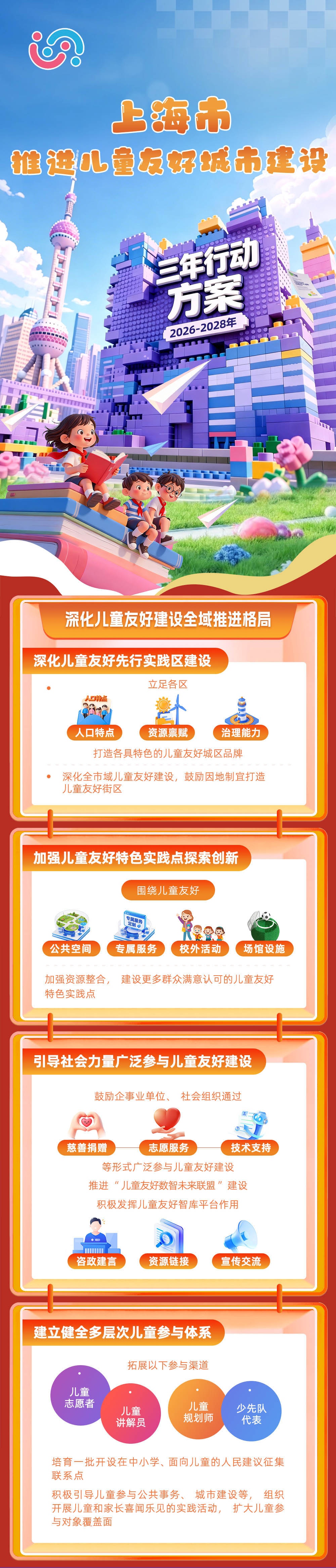 市发展改革委介绍,《上海市推进儿童友好城市建设三年行动方案(2026—2028年)》近日发布。新一轮行动方案强调下一步要深化儿童友好建设全域推进格局,将儿童优先原则落实到公共政策制定、公共空间和设施建设、公共服务供给等方面,筑牢安全底线,守护广大儿童健康安全成长。来看下图,一图读懂↓