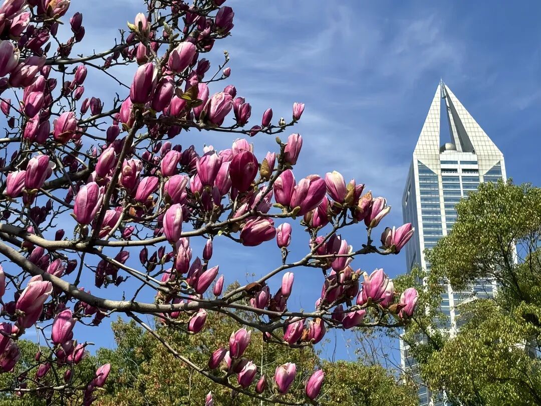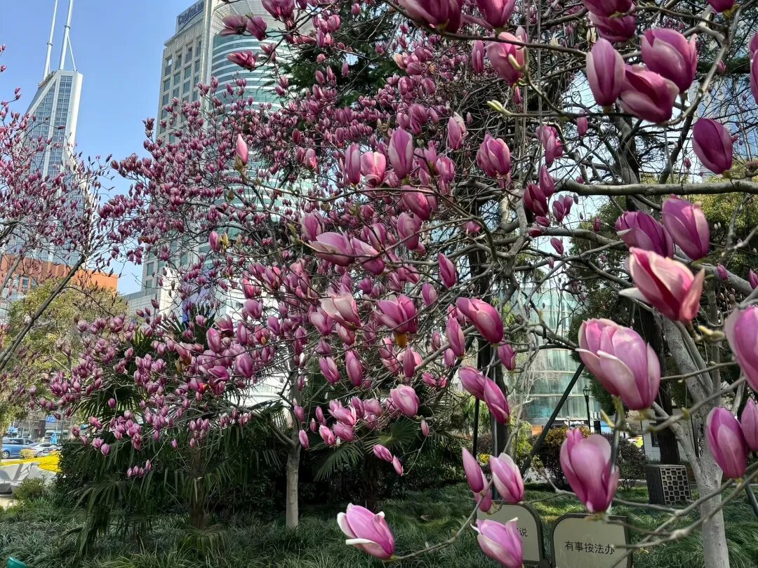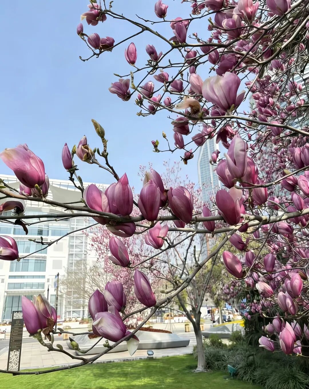 金外滩集团下属人民公园公司精心养护的近30株紫玉兰,现已迎来全盛花期。比起早早绽放的白玉兰,紫玉兰以浓郁雅致的紫色压轴登场,把春日浪漫演绎得更有东方韵味,花期预计持续至四月初,想打卡的朋友千万别错过!