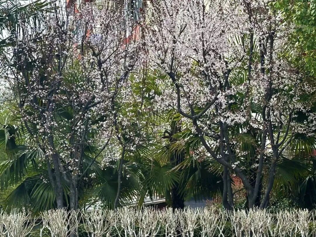 沿着绿道和石板路缓步前行,两侧的粉玉兰正值盛花期,花朵硕大饱满,在阳光下透出柔和的光泽;几株樱花也已悄然绽放,粉白的花瓣随风轻舞,落英缤纷。