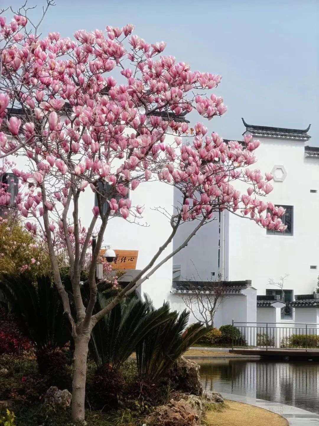 行至公园深处,徽派风格的白墙黛瓦与河水、花枝交相辉映,构成一幅江南春色的写意画卷。这里游人不多,适合静下心来慢慢走、细细看,感受春日里的静谧与美好。