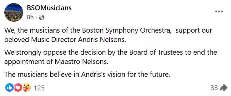 此前,波士顿交响乐团(BSO)在一份公开声明中表示:“不续签合同的决定是由BSO董事会做出,其主要原因是BSO和尼尔森斯在未来愿景上未达成一致。”