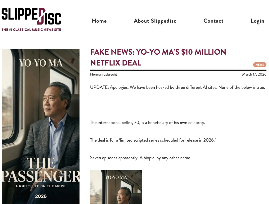 据最新消息,莱布雷希特承认关于“马友友与 Netflix 达成 1000 万美元交易”为假新闻,由人工智能创作,称自己也被三个不同网站上AI写作的文章骗了。