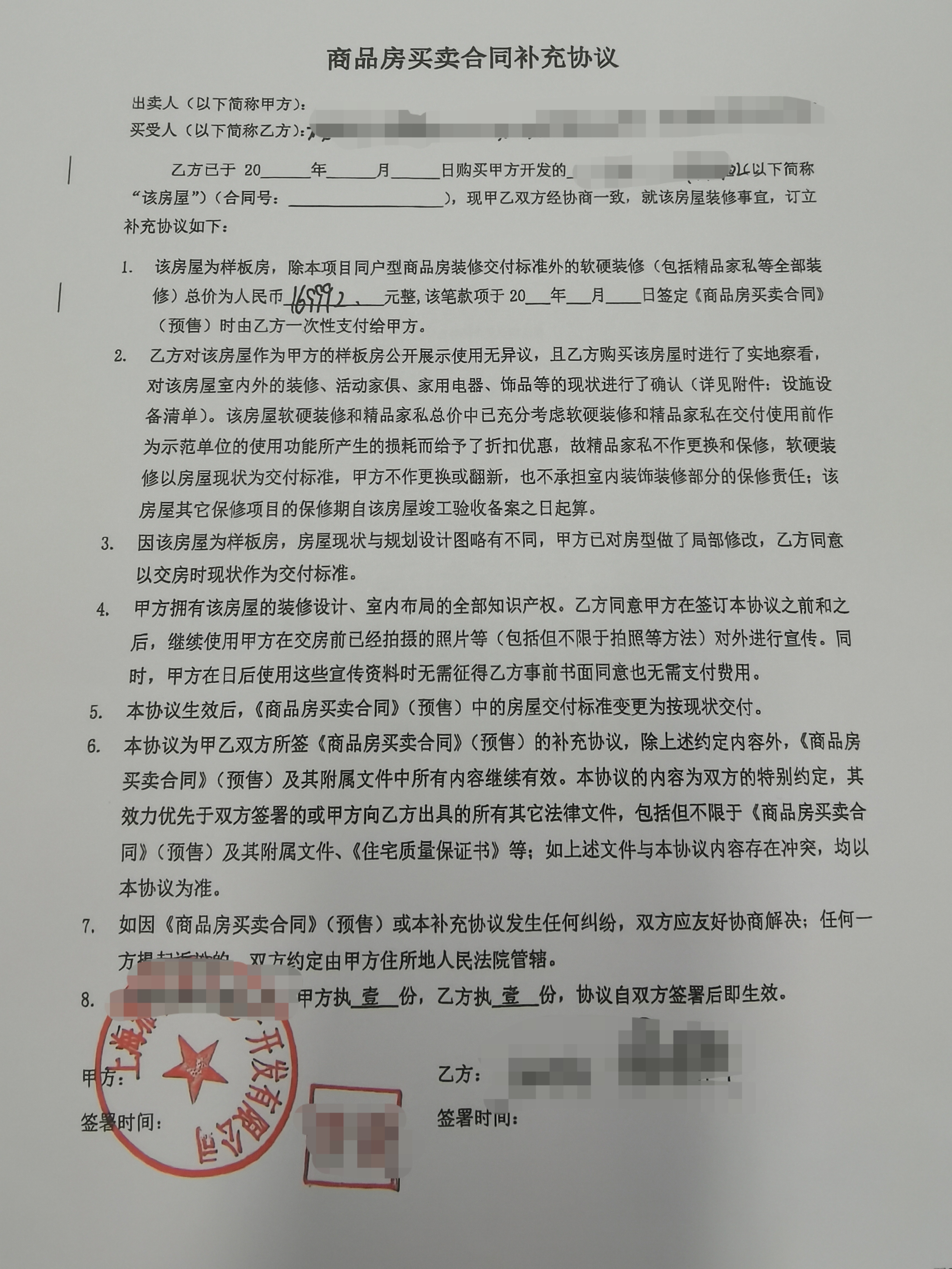 补充协议约定样板房软硬装价款